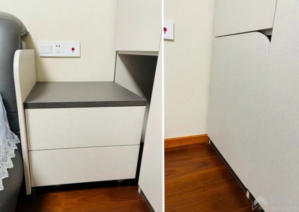 对于小户型来说卧室面积小,装了衣柜、床之后,之间的缝隙太小根本装不下床头柜怎么办?某些商家推出了一种方式,将衣柜底部掏空,设计出了内嵌床头柜,用的时候拉出来,不用的时候推进去,看起来是不是很方便?